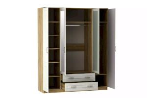 Вместительный шкаф Оливия НМ 011.84 Х поможет организовать место хранения вещей всей семьи. Шкаф имеет две секции со штангами, что позволяет рассортировать вещи по необходимым характеристикам: взрослая и детская; зимняя и летняя и т.д. Отдел с полками оптимален для размещения повседневной одежды, а два выдвижных ящика помогут раздельно хранить белье и аксессуары. Две центральных дверцы декорированы зеркалами, которые визуально увеличивают пространство комнаты и делают процесс сборов максимально удобным.
