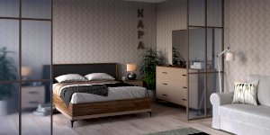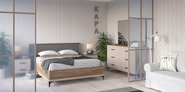 Широкий вместительный комод с шестью ящиками – функциональный модуль, который подходит не только для хранения вещей, но и для размещения телевизора. Столешница и основание комода подчеркнуты контрастным декором Дуб Табачный. Фигурные металлические опоры и ручки из массива органично дополняют модуль.