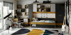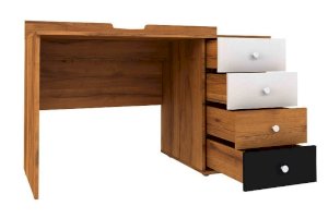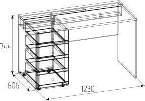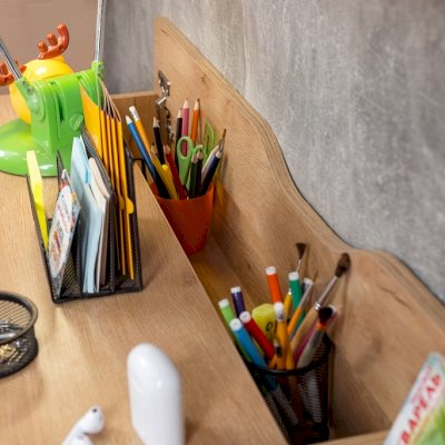 Стол письменный отличается нестандартным решением для столешницы, которая максимально адаптирована для потребностей современных детей и работе на компьютере. Под откидной её частью, которая открывается за плавный вырез, прячется ниша для хранения и отверстие с заглушкой для вывода проводов, чтобы они не запутывались и не мешали ребенку. Если ребенок ещё не занимается за компьютером, то нишу можно использовать и для размещения органайзеров с карандашами, фломастерами и красками, чтобы они не отвлекали от творчества. Дополняют стол ящики на шариковых направляющих. За счет просторной рабочей поверхности, а также возможности левосторонней и правосторонней сборки письменный стол одинаково удобен как для левши, так и для правши.