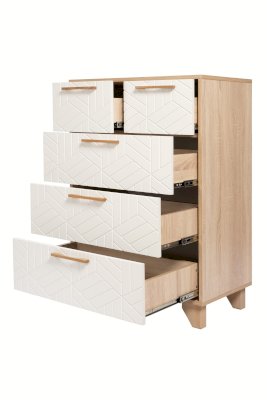 Комод Амстердам — вместительный и функциональный элемент как для спальни, так и гостиной. Модель оснащена тремя большими ящиками для хранения предметов одежды, текстиля и двумя маленькими — для личных вещей, документов, аксессуаров. Конструкцией предусмотрены шариковые направляющие полного выдвижения.