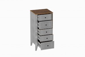 Комод с 5 ящиками Валенсия выполнен из ЛДСП в комбинации Дуб натуральный светлый / Персидский жемчуг.