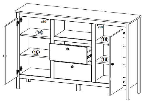 Открытое отделение и 2 выдвижных ящика на металлических направляющих