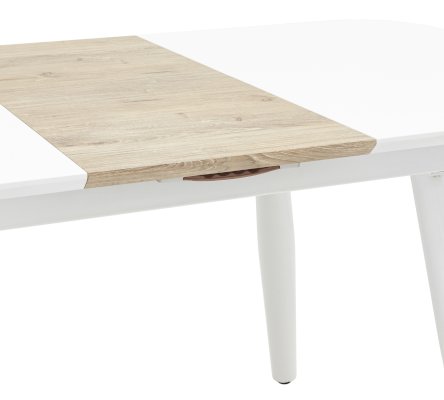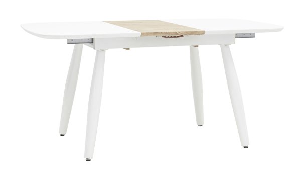 Обеденный стол раскладной. Столешница выполнена из прочного и долговечного МДФ. Светлая глянцевая поверхность столешницы гармонично сочетается с металлическими ножками. Простая прямоугольная форма стола позволит легко вписать его в современный интерьер, стол украсит кухню, гостиную или современное кафе, ресторан. Дополнительная вкладка стола выполнена из МДФ с бумажным шпоном цвета беленого дуба. На вкладке предусмотрена петля для комфортного открытия стола одной рукой.