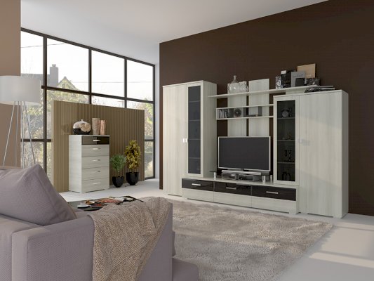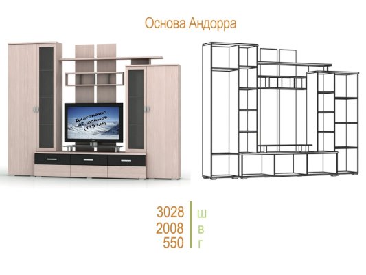 Андорра — это образец оптимального сочетания таких важных для современной мебели характеристик как: открытые стеллажи, закрытые системы хранения, шкафы с витринами.
