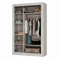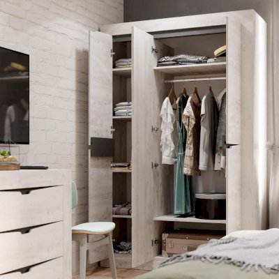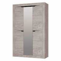 Трёхстворчатый распашной шкаф «Леонардо» с одной стороны имеет пять вместительных полок для белья, с другой стороны – удобную антресольную полку для хранения головных уборов, горизонтальную хромированную штангу для плечиков и нижнюю полку, в которой удобно хранить коробки с обувью. Особый шарм ему придаёт зеркало в полный рост, которое располагается на фасаде центральной створки. Сборка универсальна.