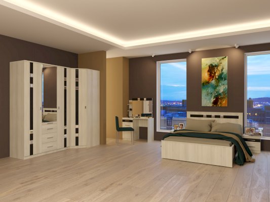 Спальный гарнитур Николь благодаря белому цвету выглядит воздушным и современным. Черное стекло и зеркала добавляют контраст и изящество.