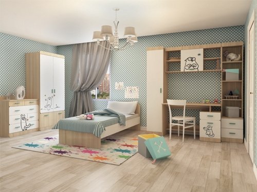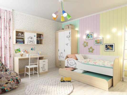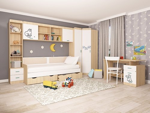 Детская «Кот» - удобная и безопасная мебель для вашего ребенка. Яркий принт на мебели создаст атмосферу в детской комнате. Каждый модуль комплектуется ручками двух цветов, что даст Вам прекрасную возможность, выбрать более подходящий цвет для вашего интерьера.