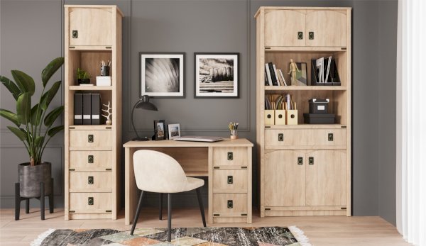 Шкаф - универсальное решение для хранения вещей. Две открытые полки подходят для книг и учебников, декоративных предметов. Декоративные накладки и профиль из МДФ по вертикальным краям закрывают острые края корпуса и придают шкафу более эффектный и надежной вид. Стилизованные металлические ручки MARINE бронзового цвета и декоративные элементы в тон – это изюминка шкафа Валенсия. Идеально компонуется со всеми модулями системы Валенсия.