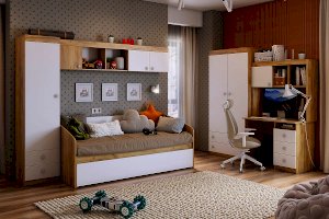 В закрытые шкафы и открытые ниши поместятся все учебники книги и сувениры. Можно повесить между шкафов над софой или использовать как самостоятельное изделие.