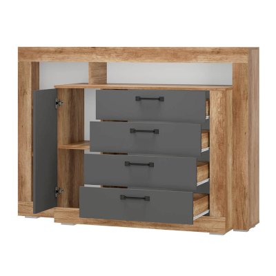 Комод многофункциональный Прима КМ-17  - удобная система хранения для одежды, постельных принадлежностей или других хозяйственных аксессуаров. Все необходимые вещи можно расположить на полках за распашной створкой, а также в трёх вместительных выдвижных ящиках на роликовых направляющих, которые обеспечивают легкую и бесшумную эксплуатацию модели.